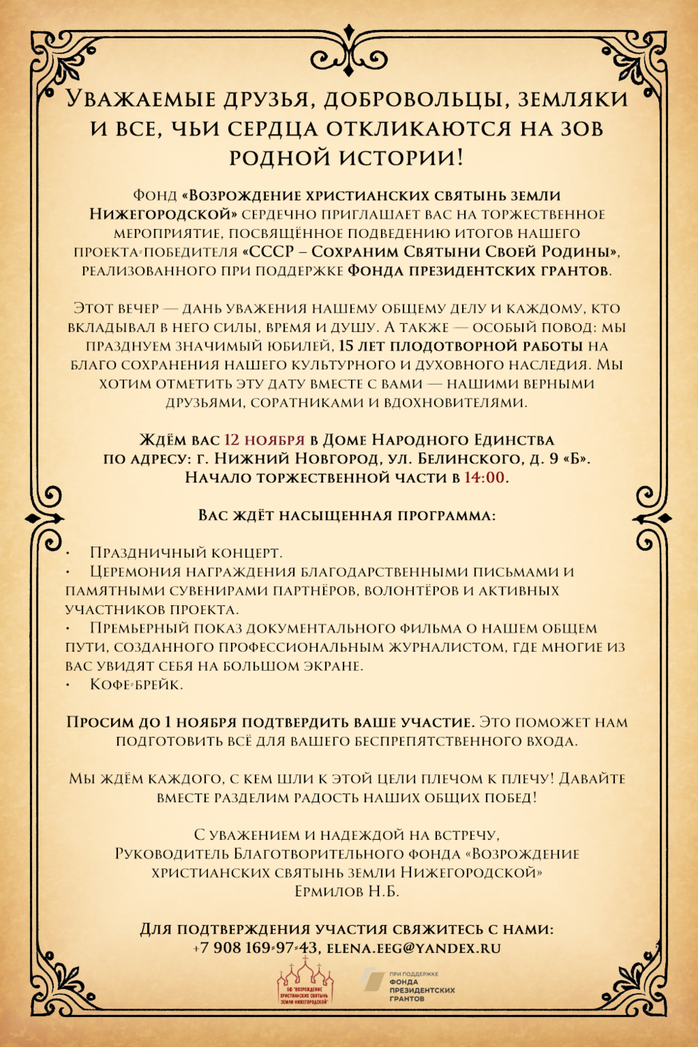Фонд «Возрождение христианских святынь земли Нижегородской» сердечно приглашает вас на торжественное мероприятие, посвящённое подведению итогов нашего проекта-победителя «СССР – Сохраним Святыни Своей Родины», реализованного при поддержке Фонда президентских грантов.